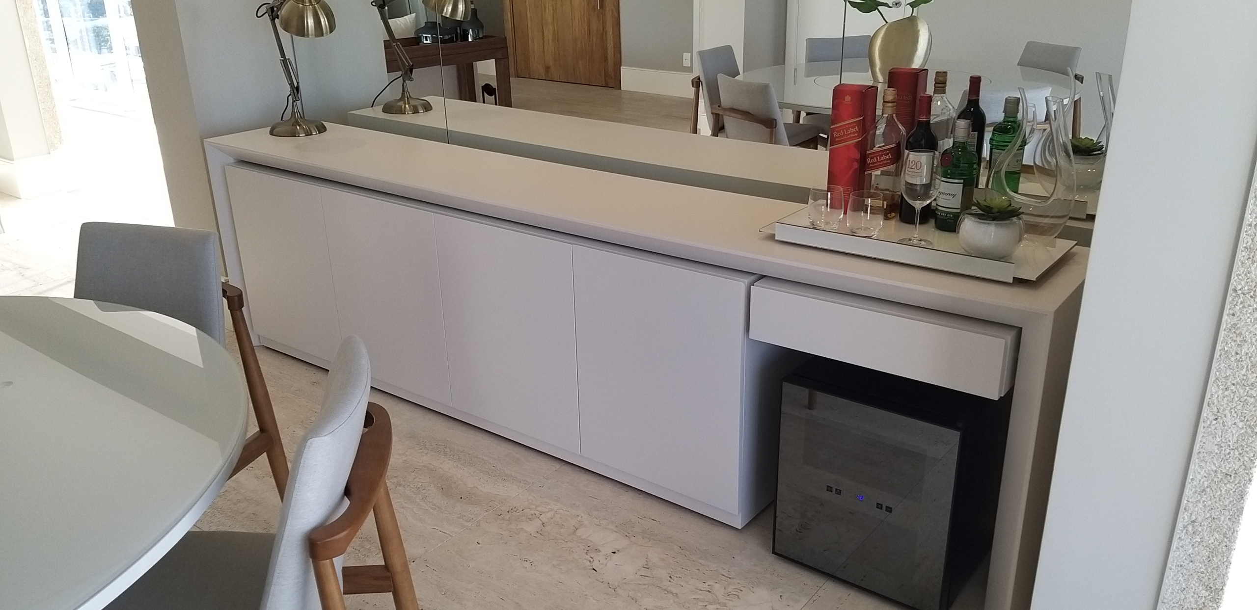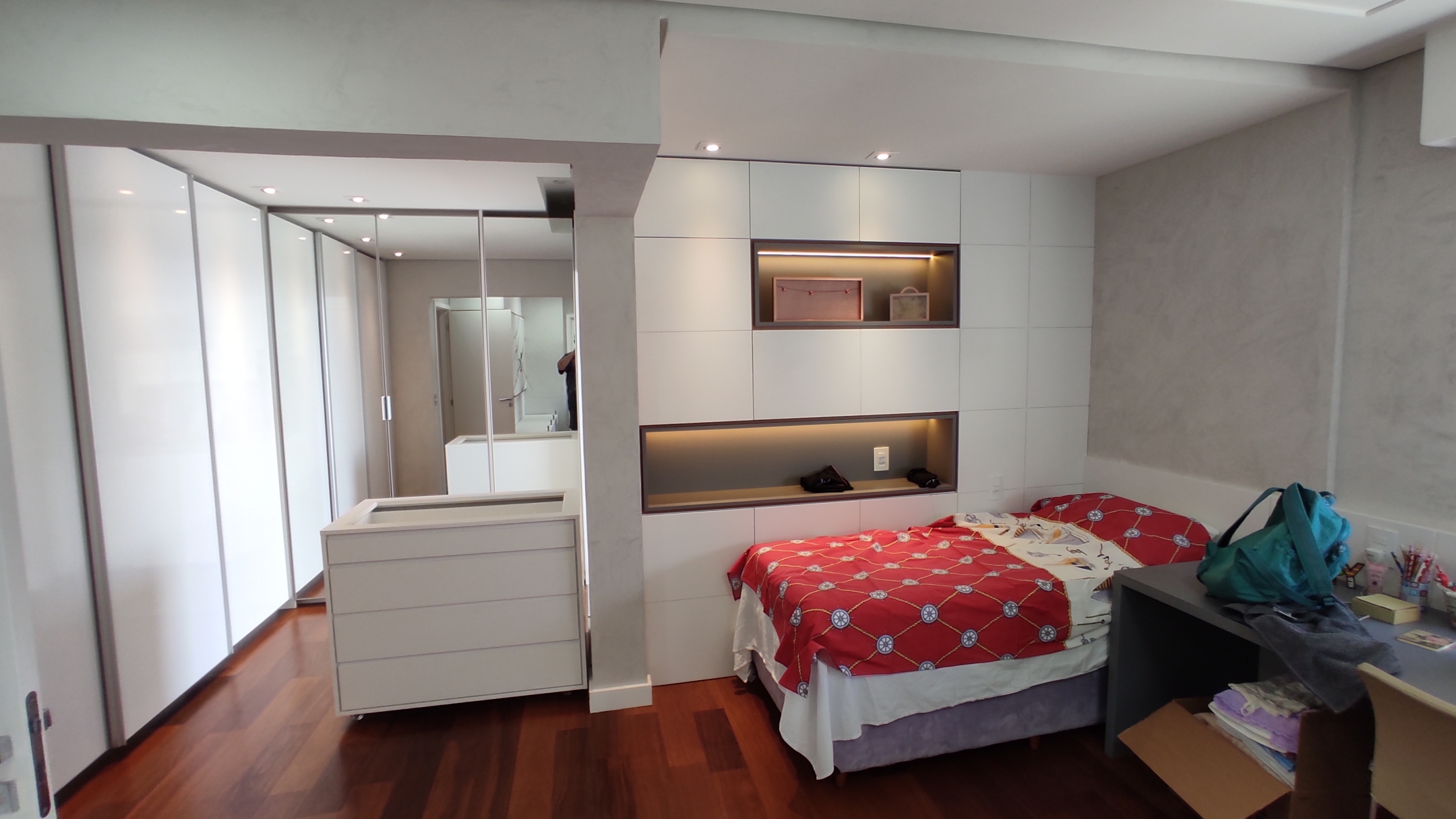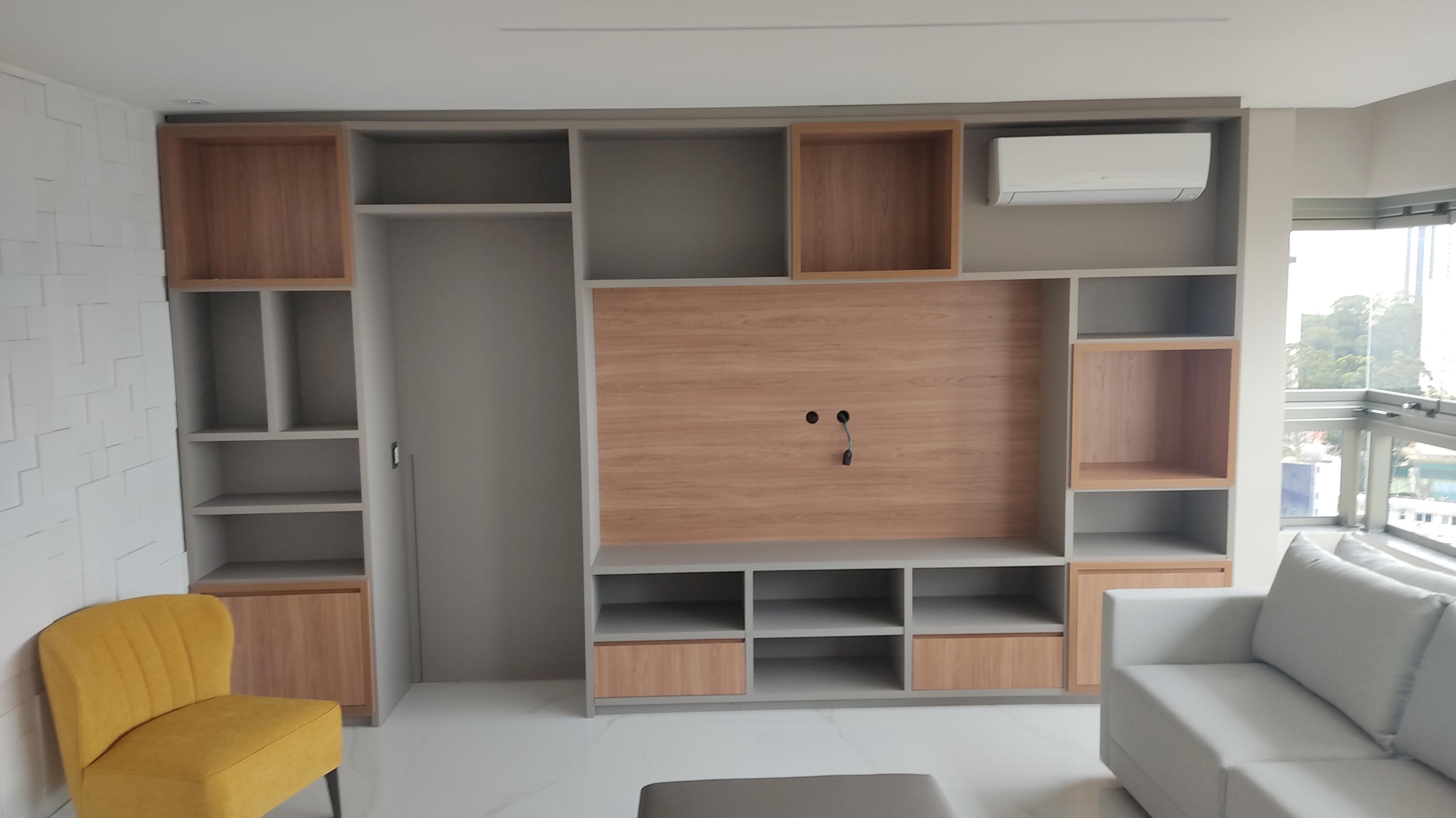 Painel com frisos, móvel baixo com gavetões, armário Lateral com porta de giro, porta de correr embutida