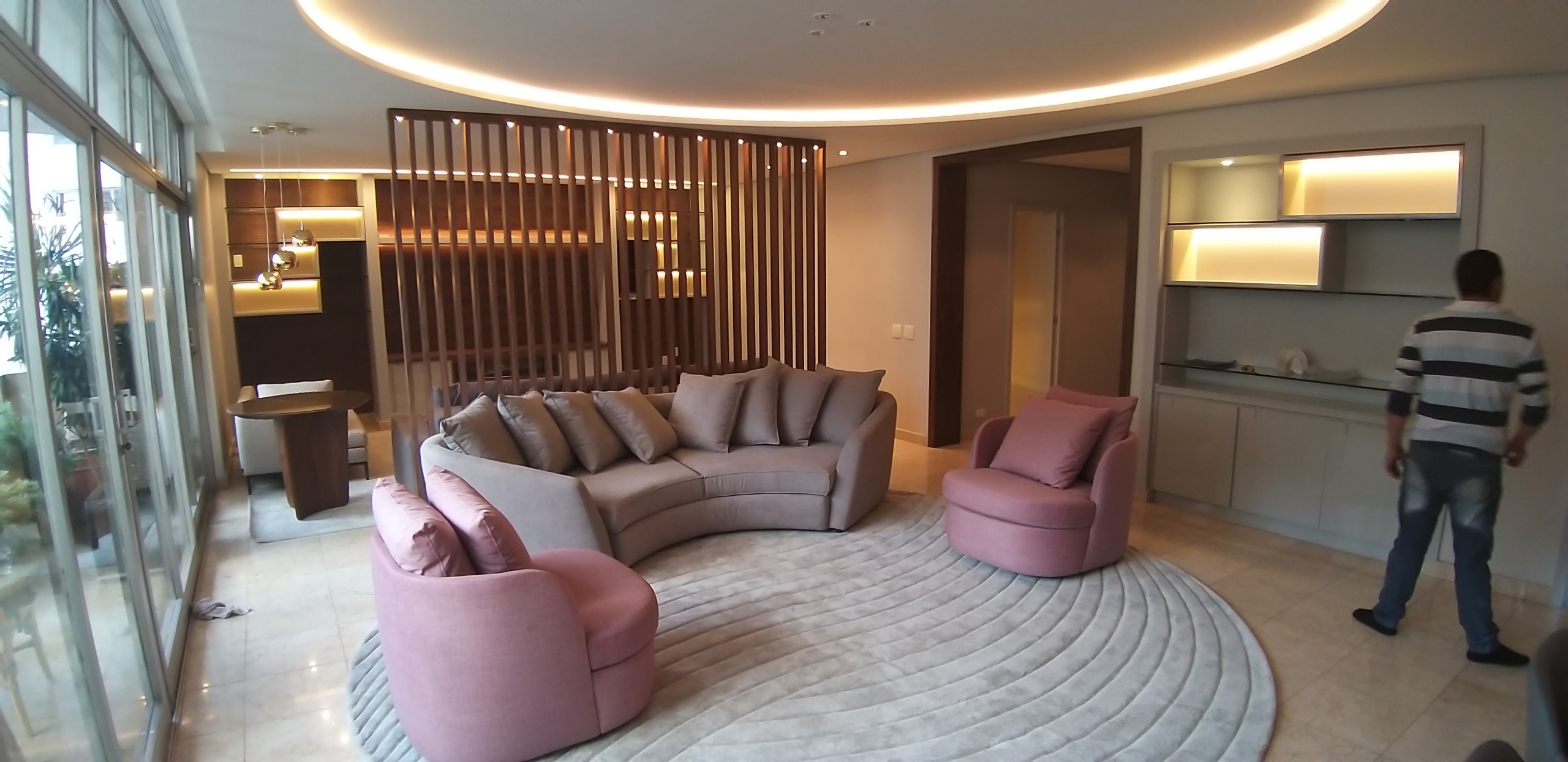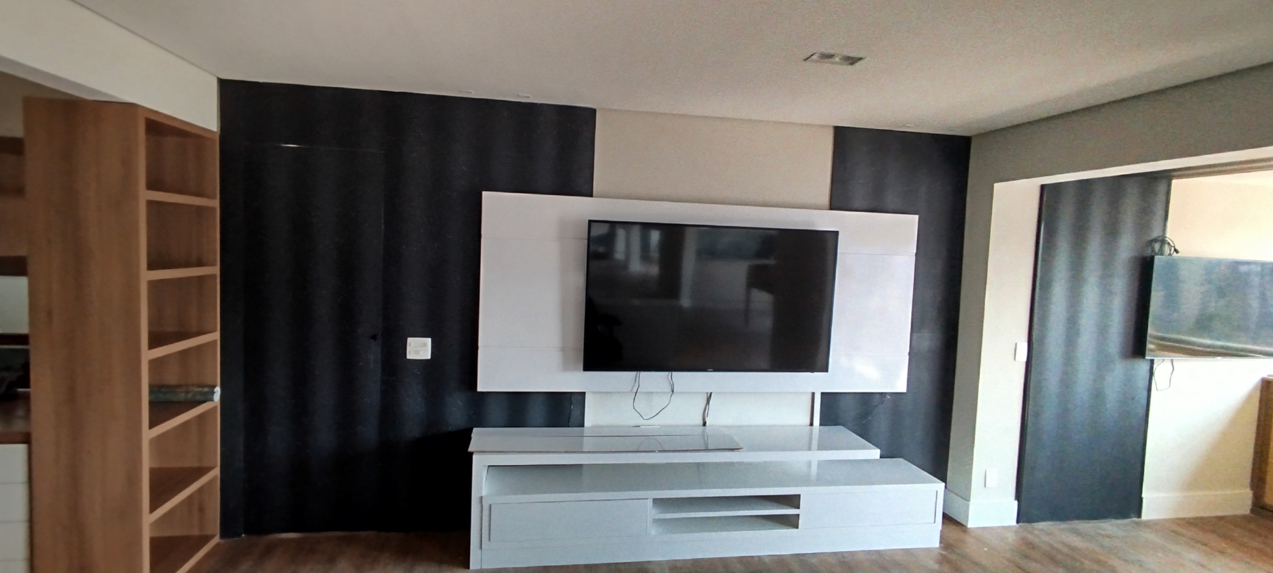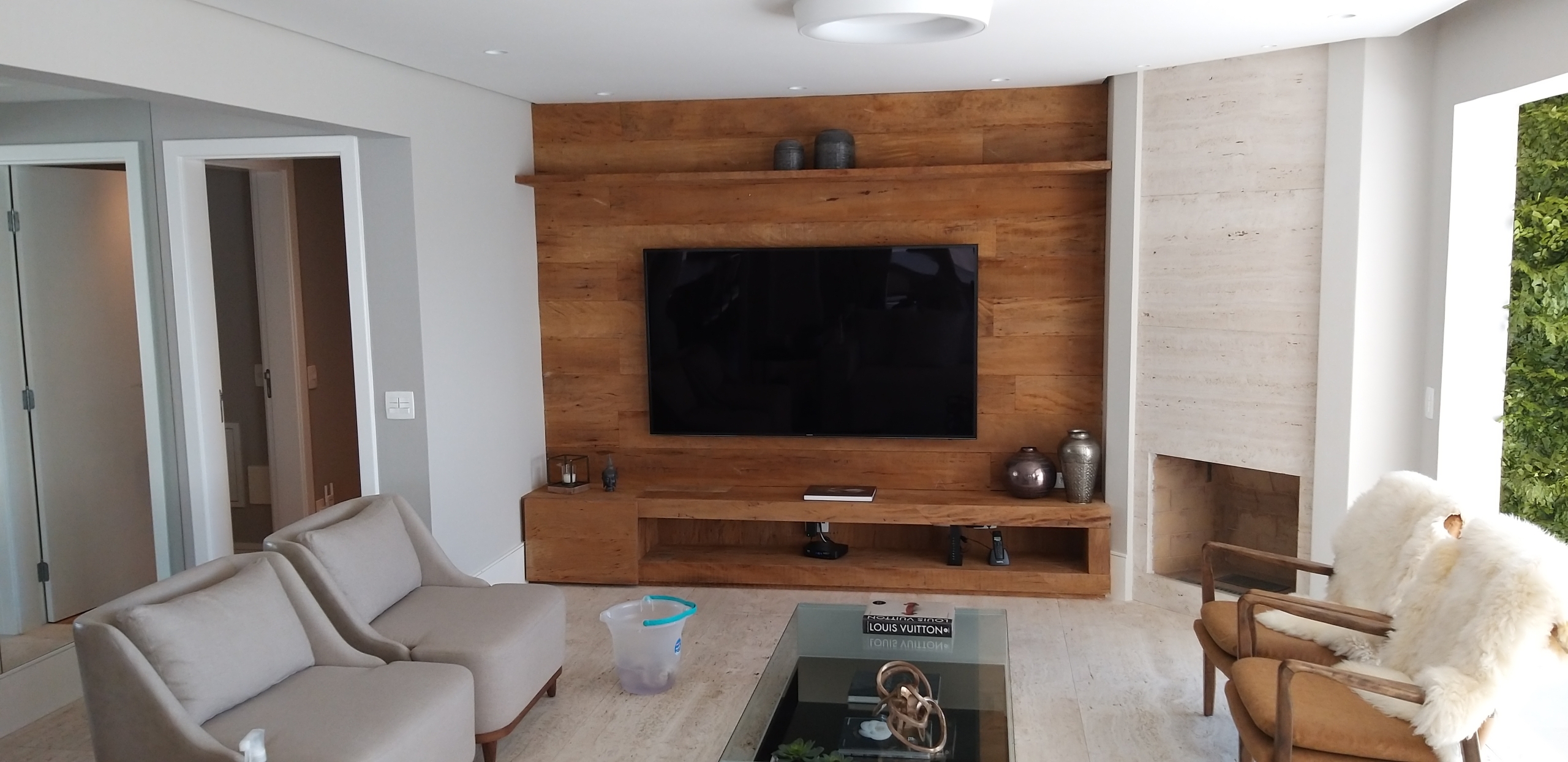 Painel com frisos, móvel baixo com gavetões, armário Lateral com porta de giro, porta de correr embutida