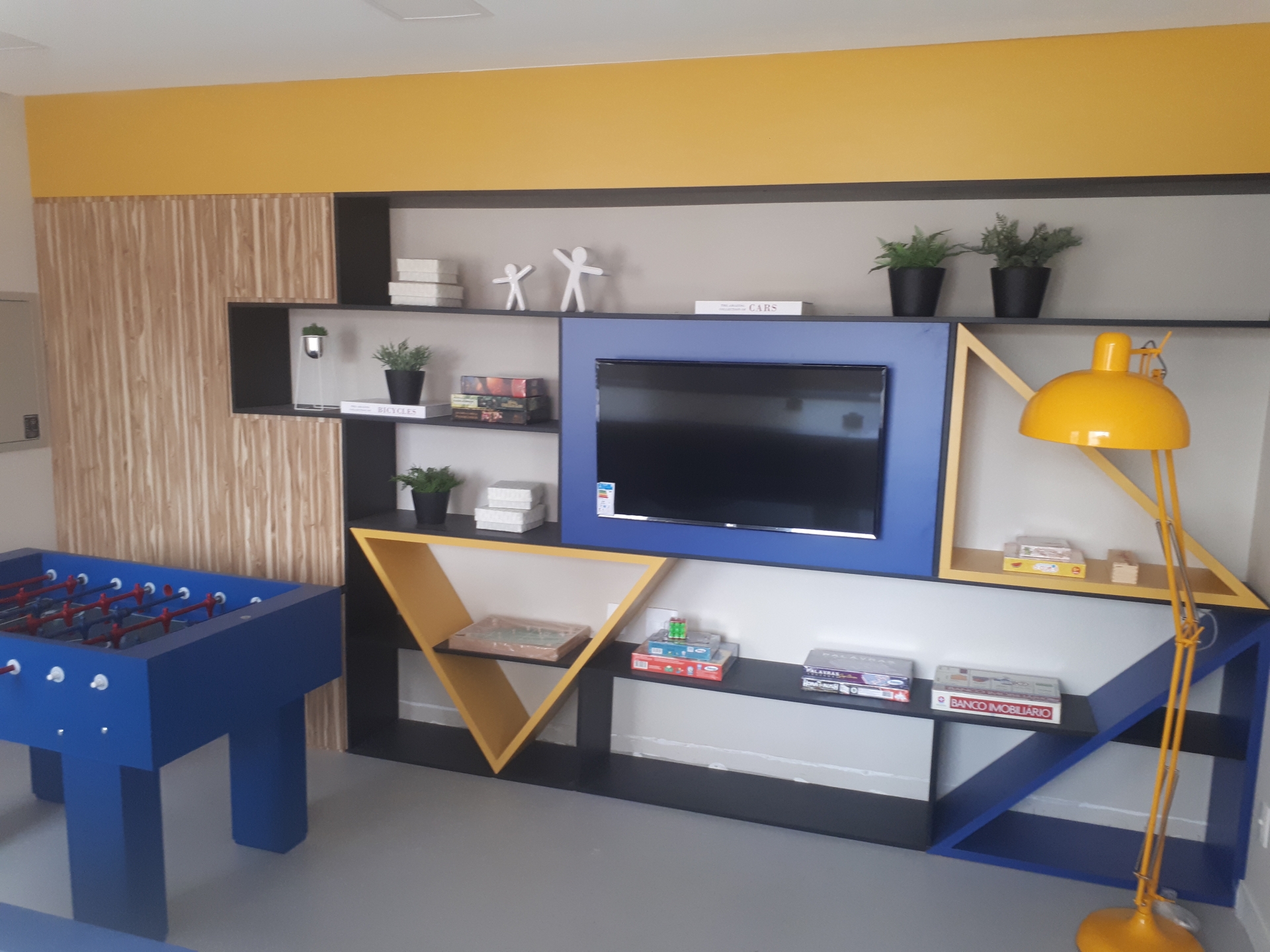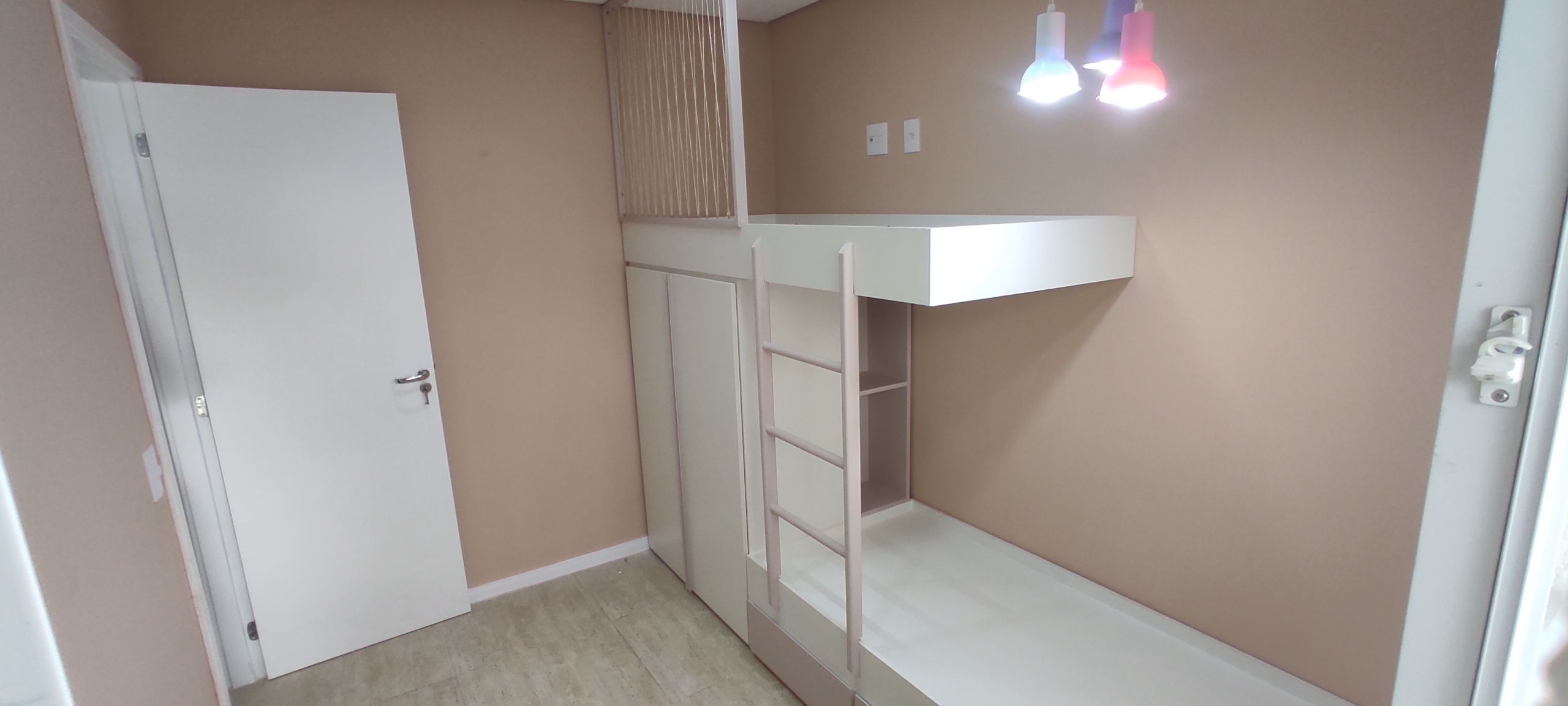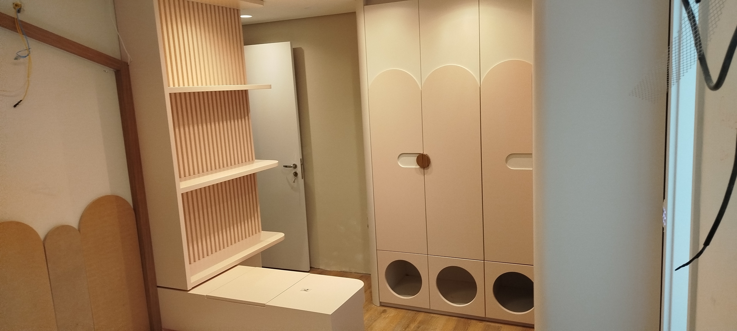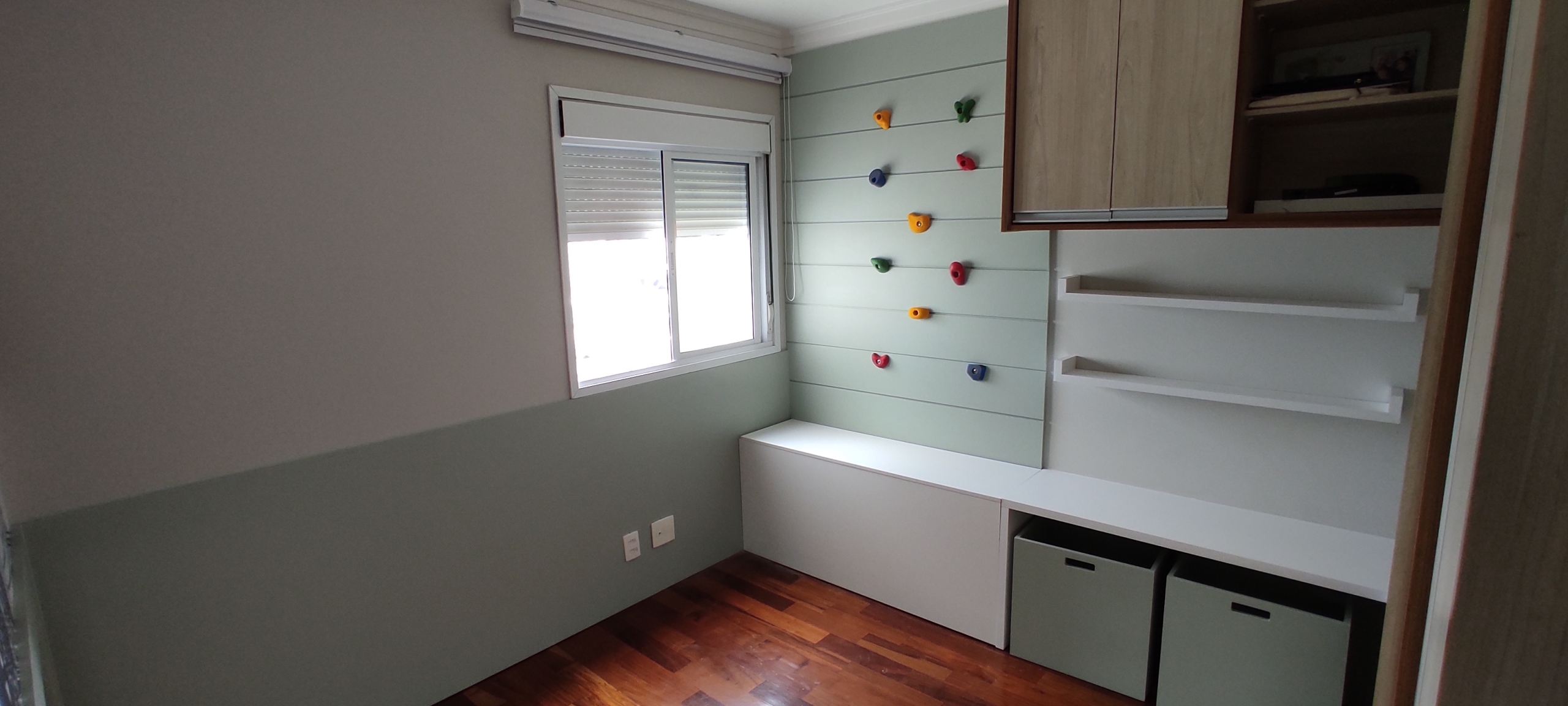 Painel liso, painel com frisos, bancada infantil, baú com rodinhas, prateleiras suspensas, armário suspenso com portas de giro