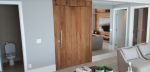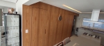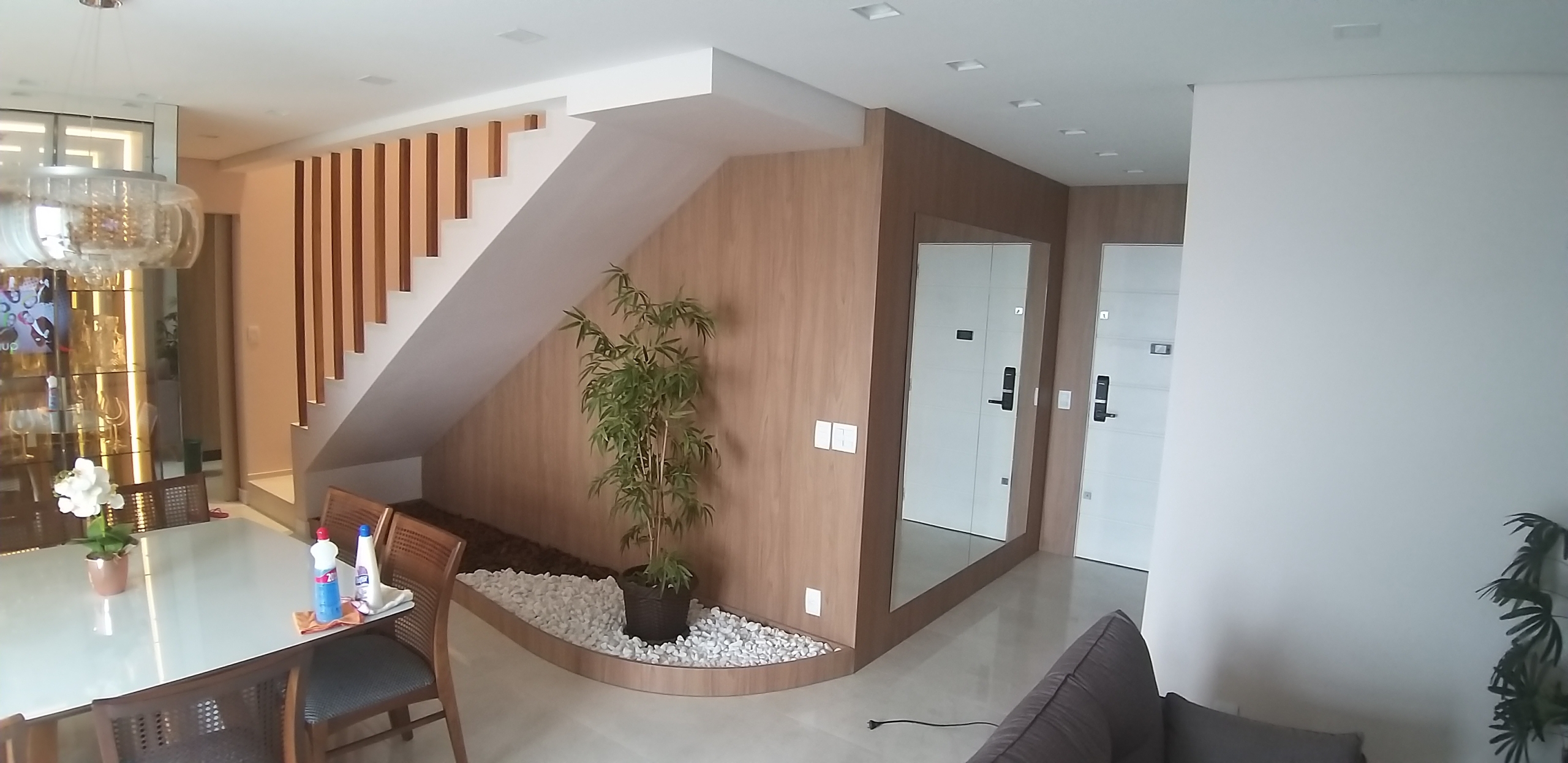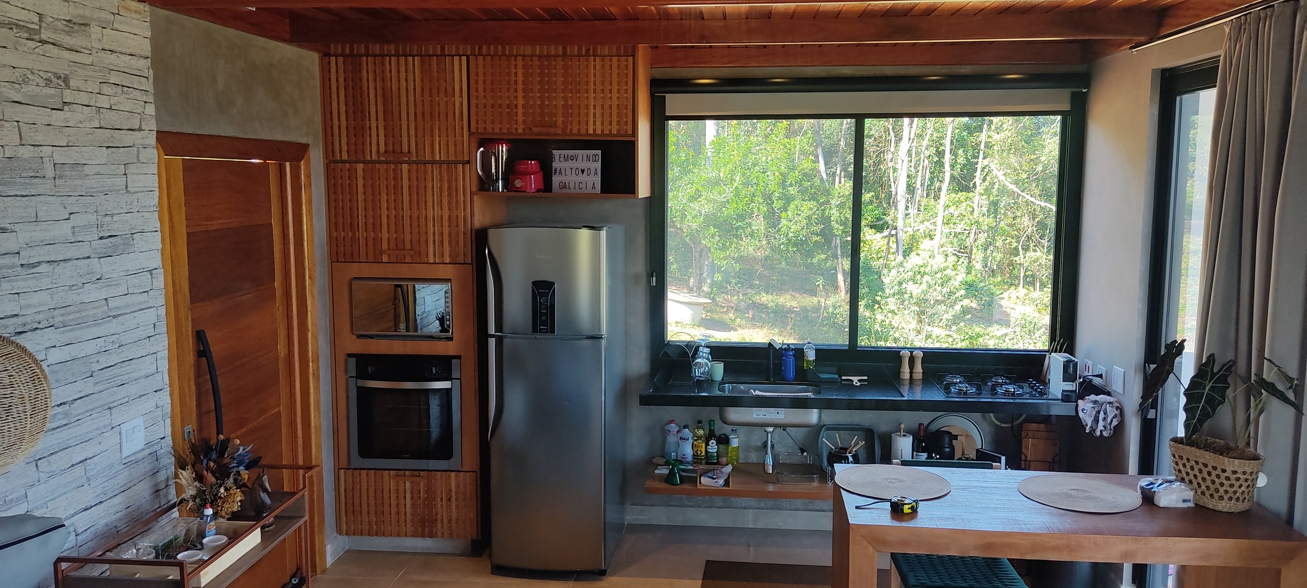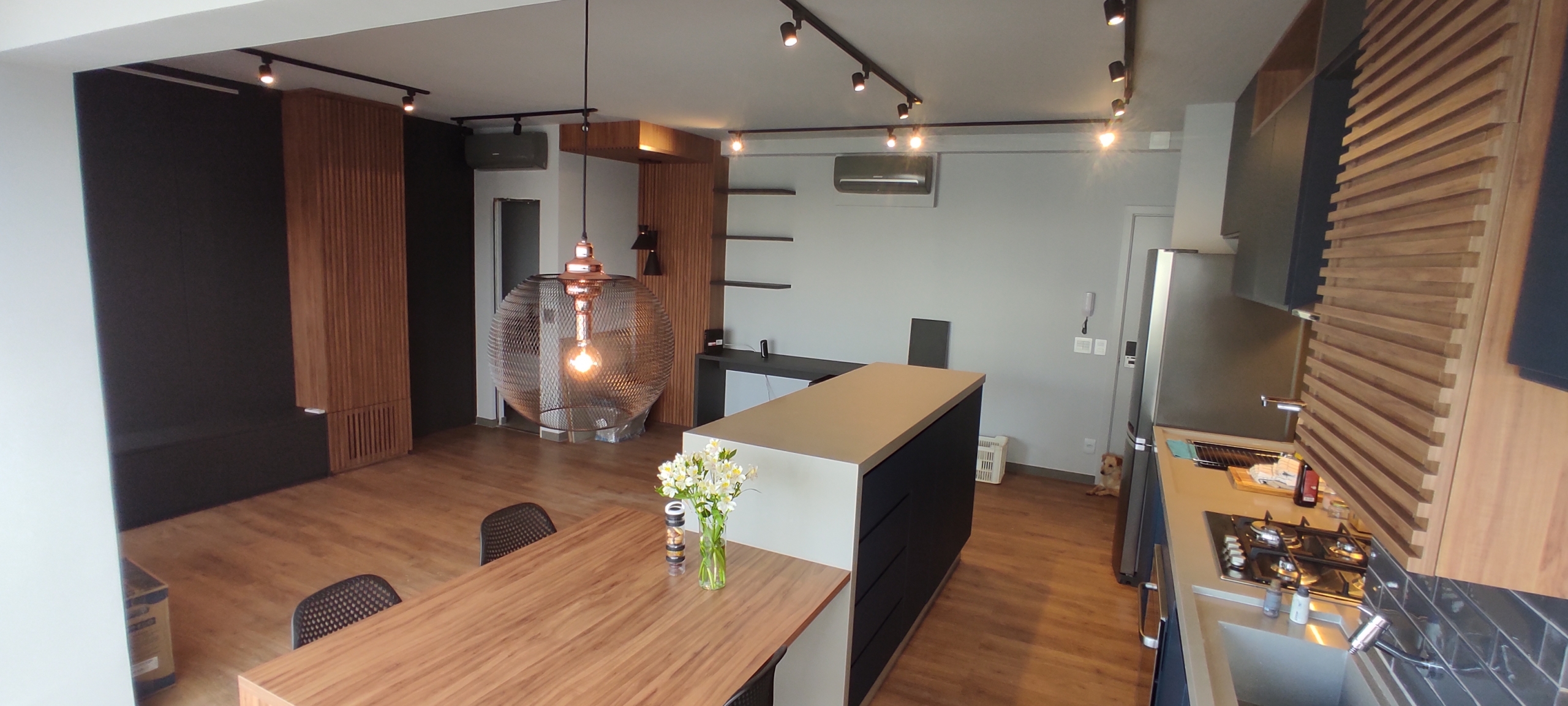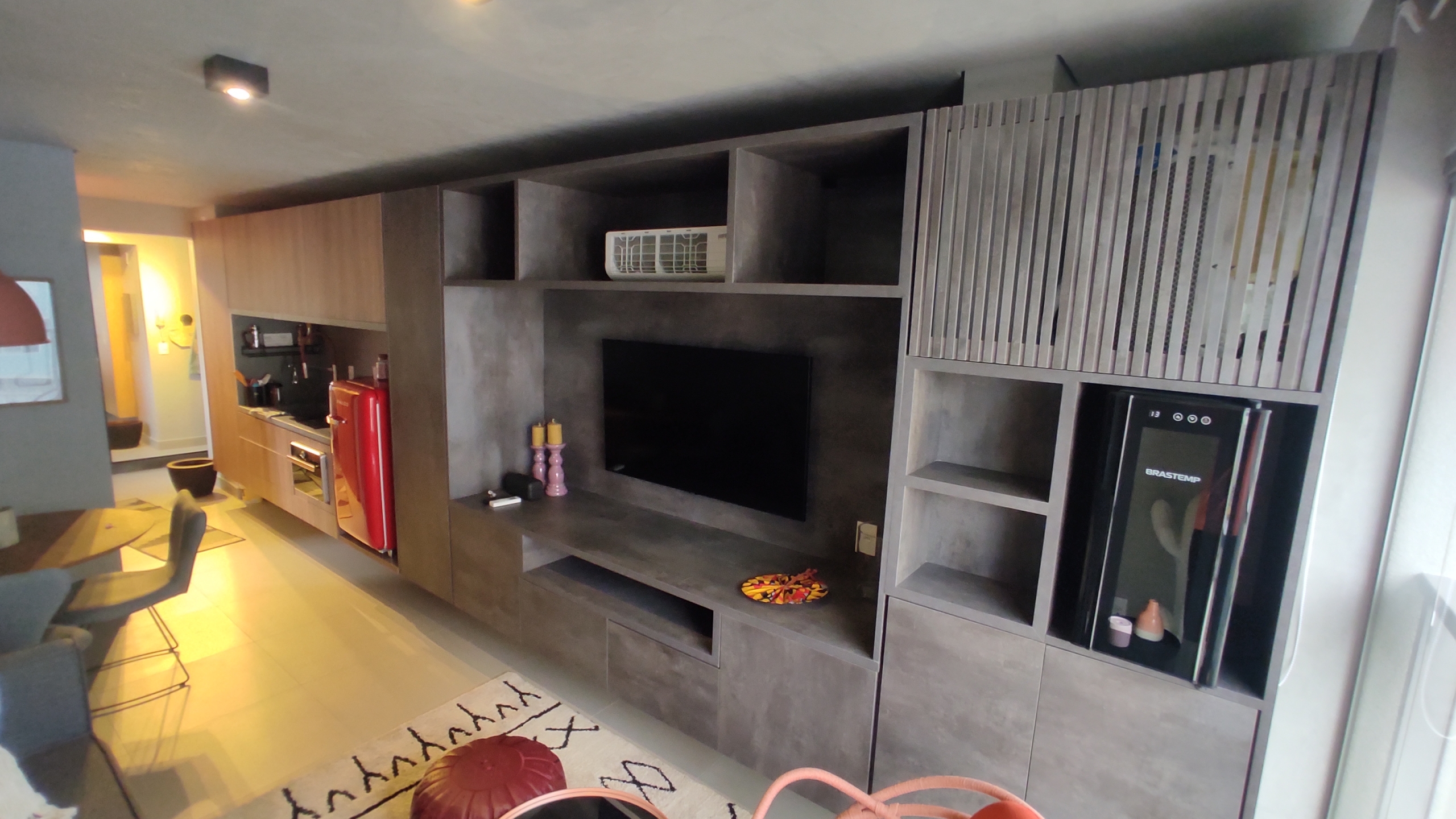 Painel liso com porta embutida, painel ripado e armário com nicho para geladeira