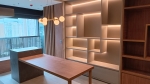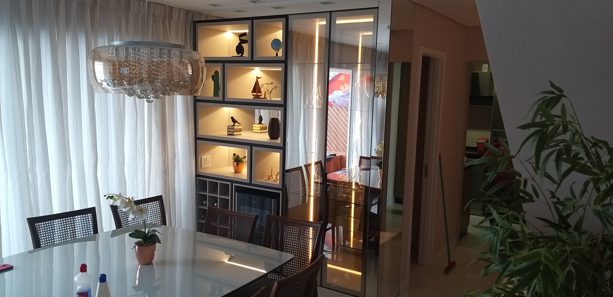 Estante com nichos iluminados e cristaleira com portas em vidro reflecta