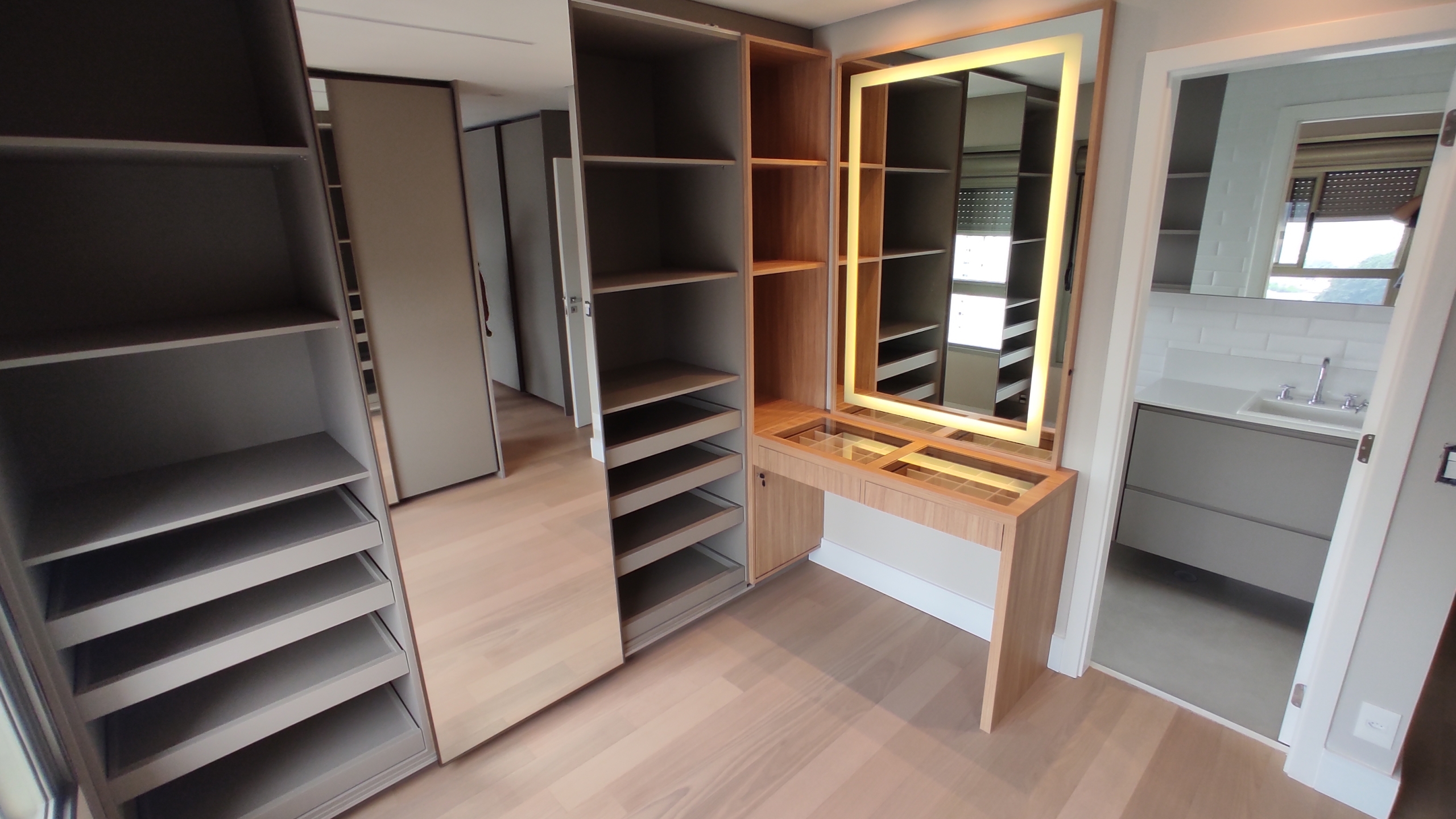 Armário com uma porta de correr, bancada com visor e espelho camarim