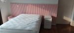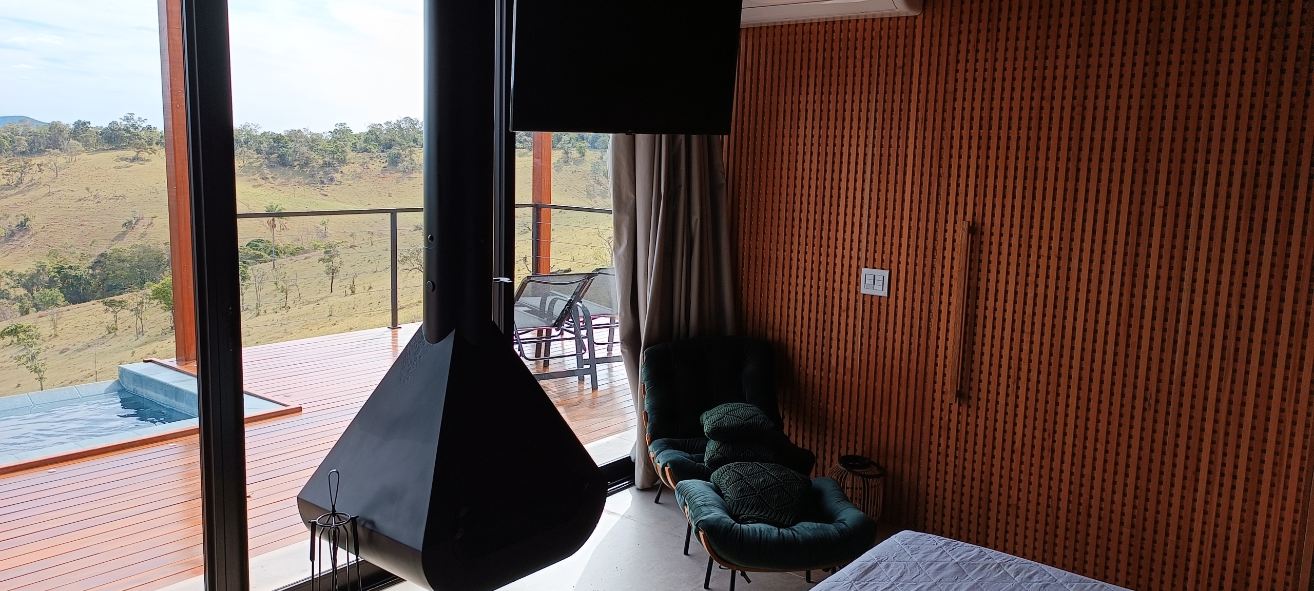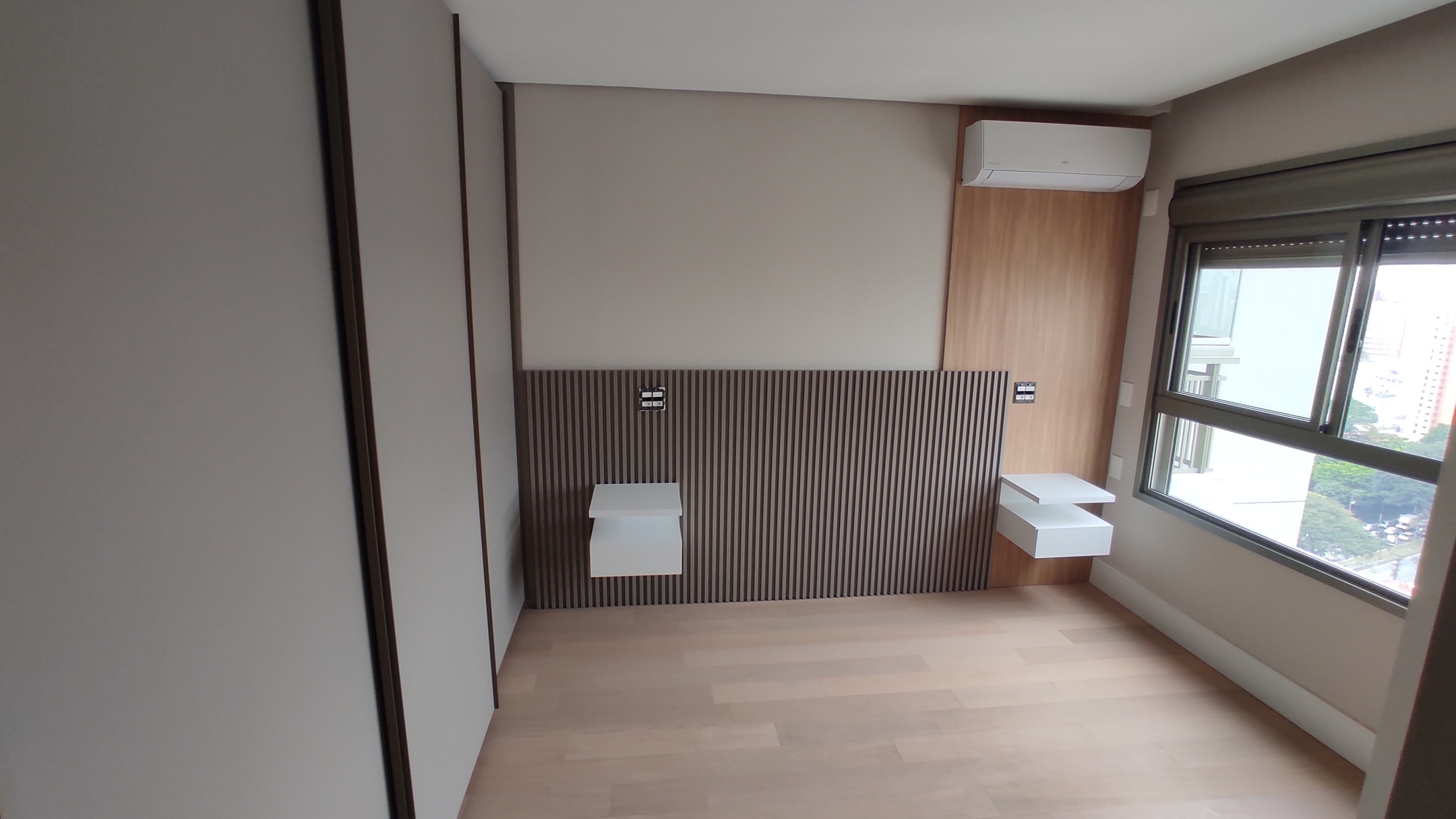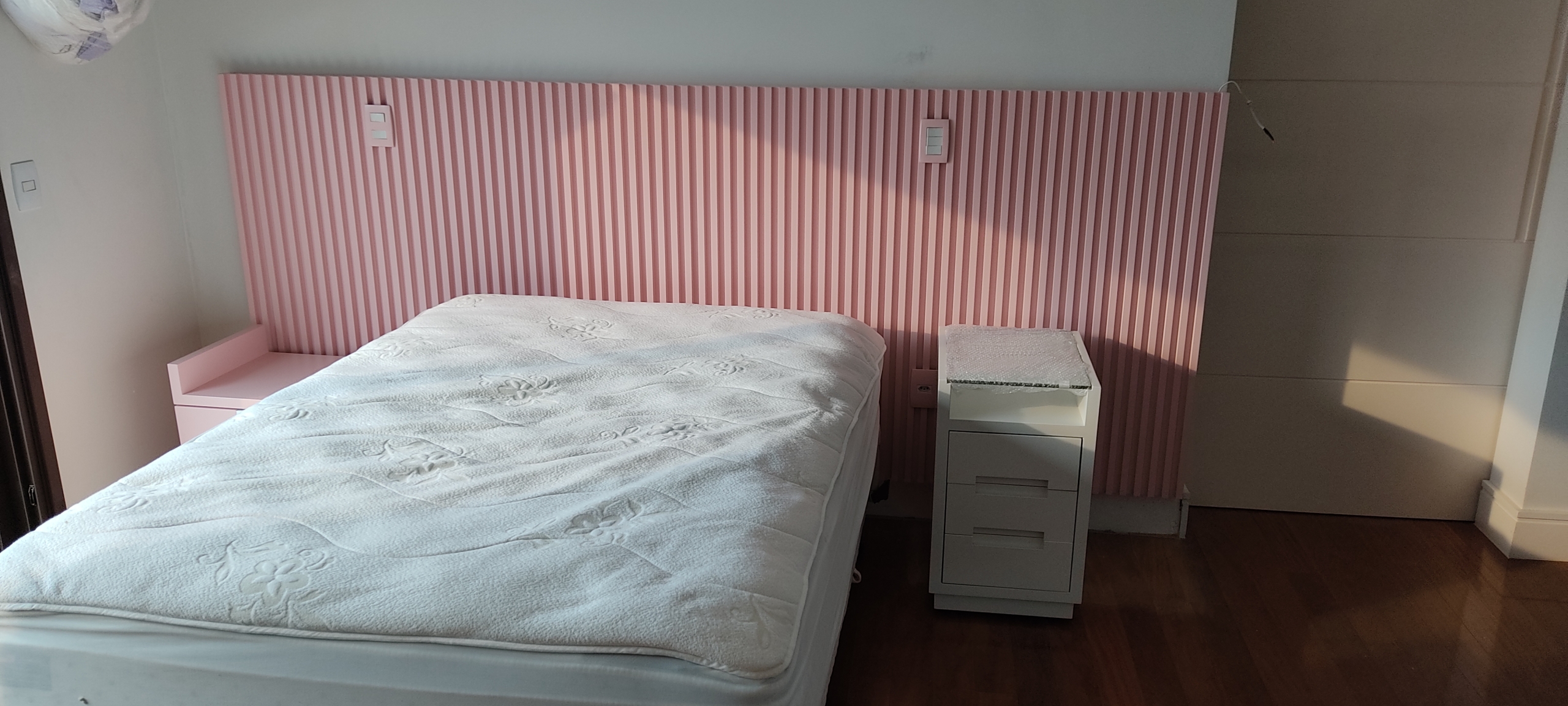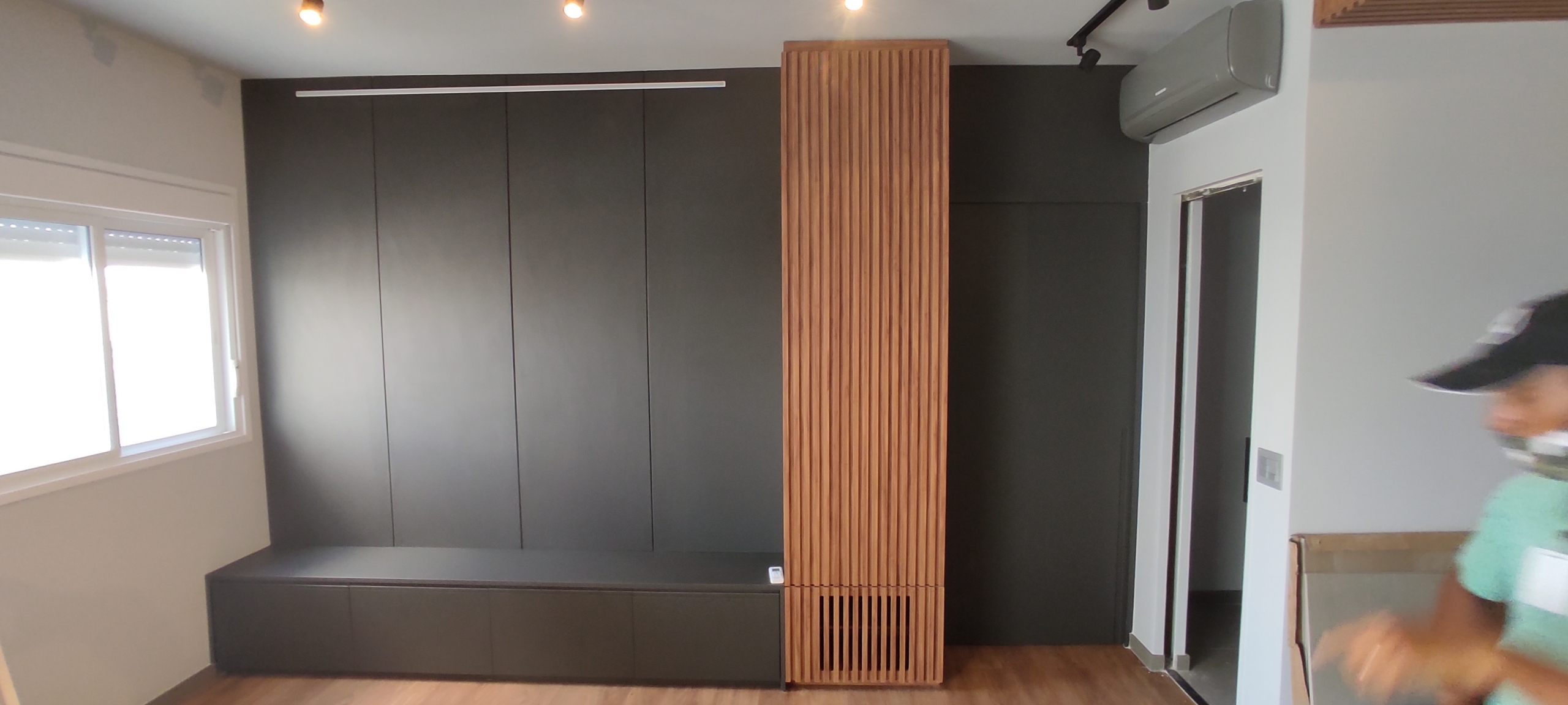 Painel liso, painel ripado, criados mudos suspensos, armário com portas de correr