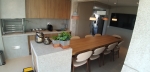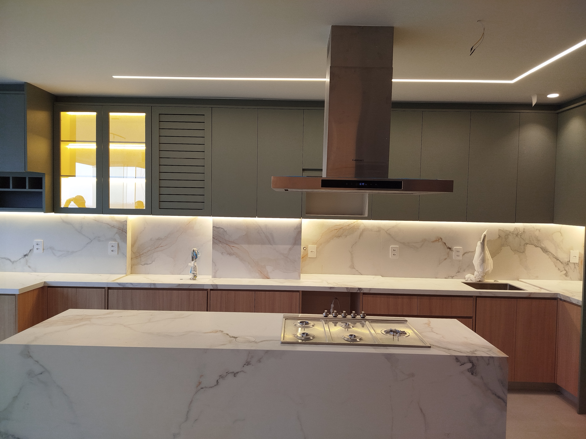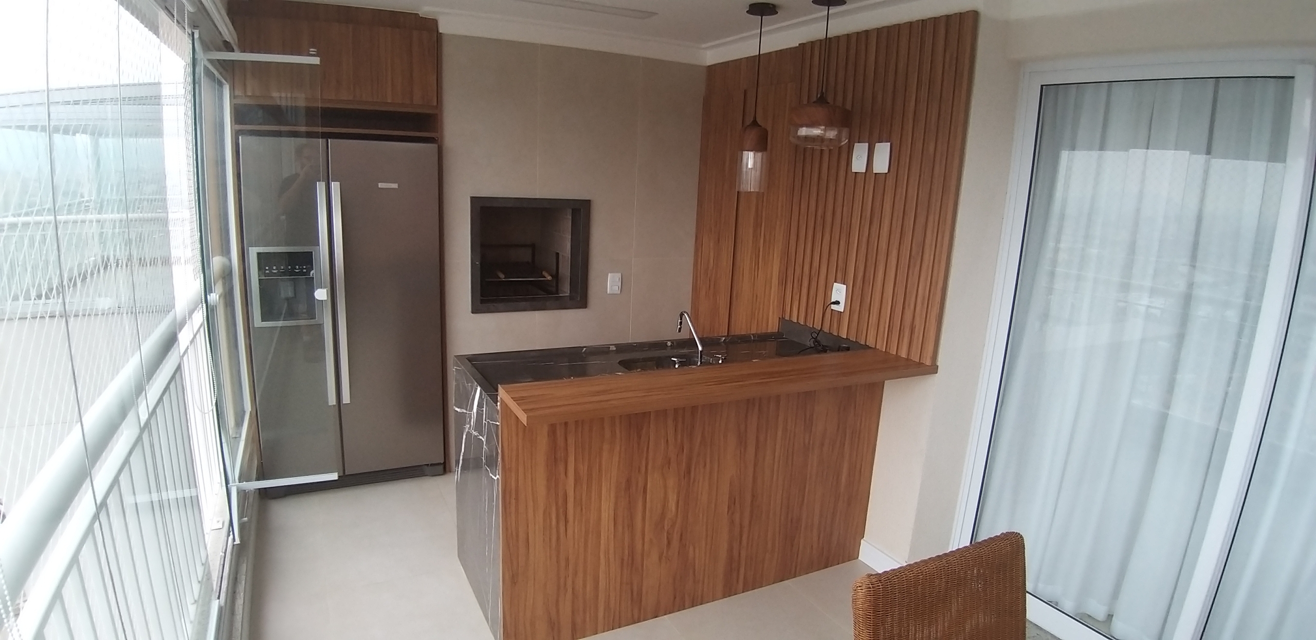 Armário lateral com gavetas e portas basculantes, nicho para forno e micro-ondas, prateleira suspensa sob a pia
