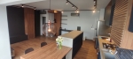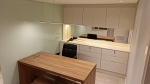 Armário com portas de giro, bancada de apoio e gavetas, mesa com tomadas